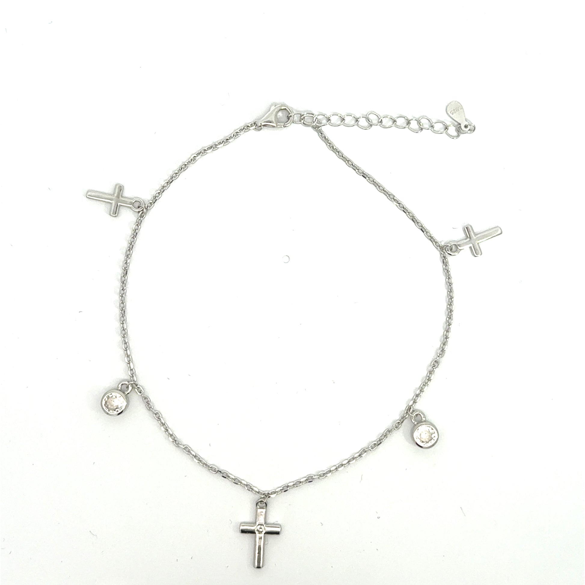 This stunning silver bracelet features delicate cross charms that add a touch of spirituality to your style. Perfect for everyday wear or special occasions, it effortlessly combines elegance with meaning. The adjustable chain ensures a comfortable fit for any wrist size.