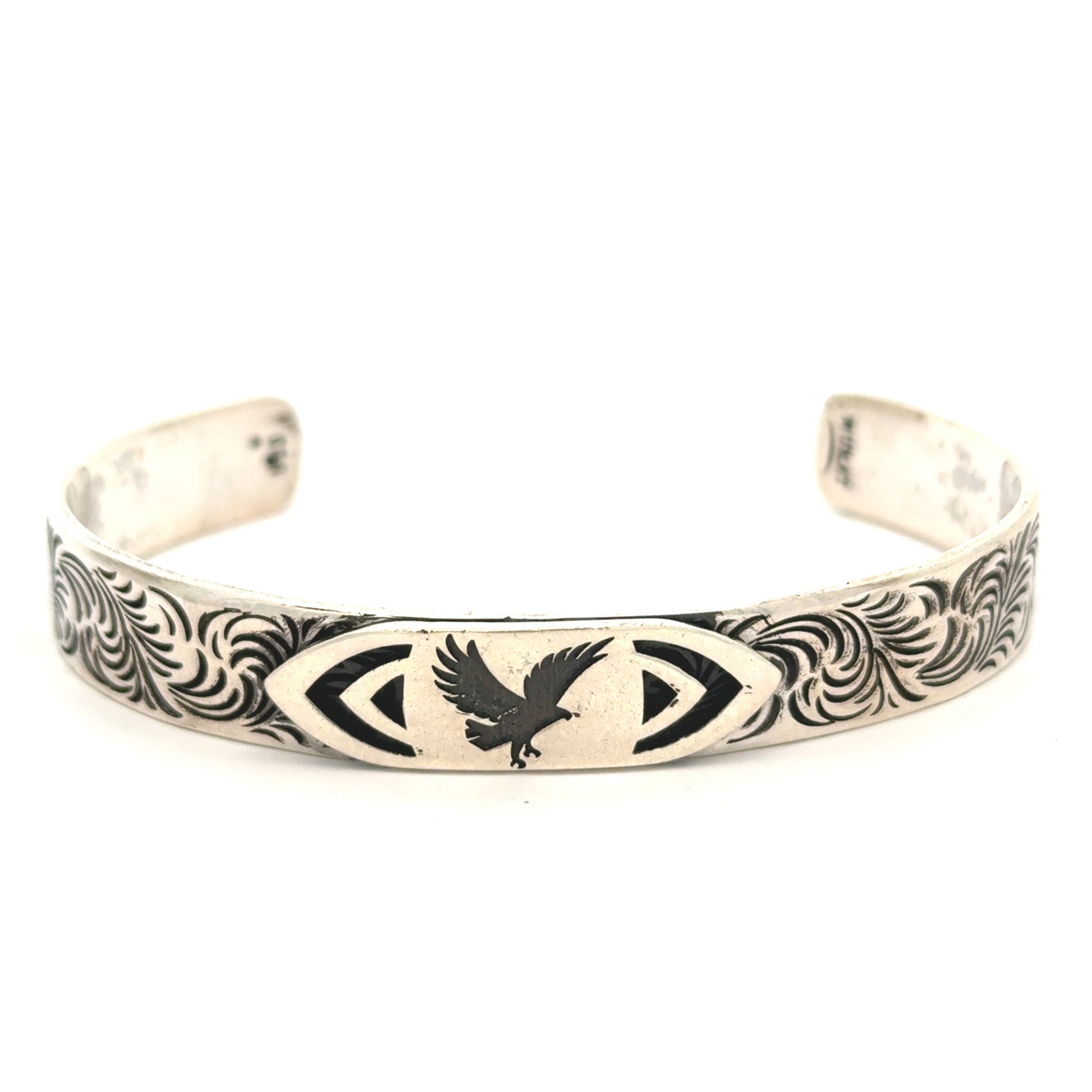This stunning silver cuff bracelet features intricate engravings and a striking eagle motif at its center. Perfect for adding a touch of elegance to any outfit, it embodies both style and craftsmanship. Wear it alone or stack it with other pieces for a bold statement.
